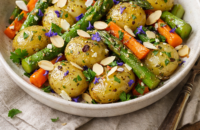 Insalata tiepida di patate novelle, asparagi, carote e mandorle.