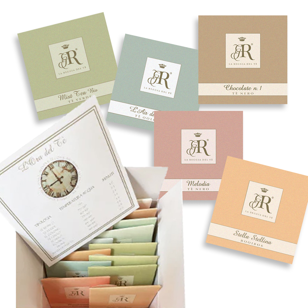 | Ingredienti | Assortimento di tè neri, verdi, oolong e rooibos con fiori, spezie e frutta (es. bergamotto, cacao, vaniglia, agrumi, frutti rossi, zenzero, menta). Prodotto da La Reggia del Tè con ingredienti selezionati; senza aromi artificiali ove indicato a catalogo. |