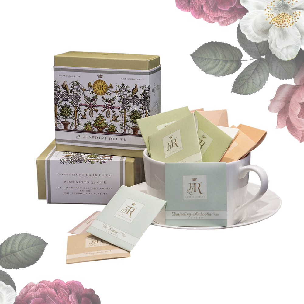 Uno scrigno raffinato che raccoglie 16 filtri assortiti selezionati da La Reggia del Tè: classici intramontabili e blend creativi che raccontano giardini, stagioni e atmosfere diverse.
