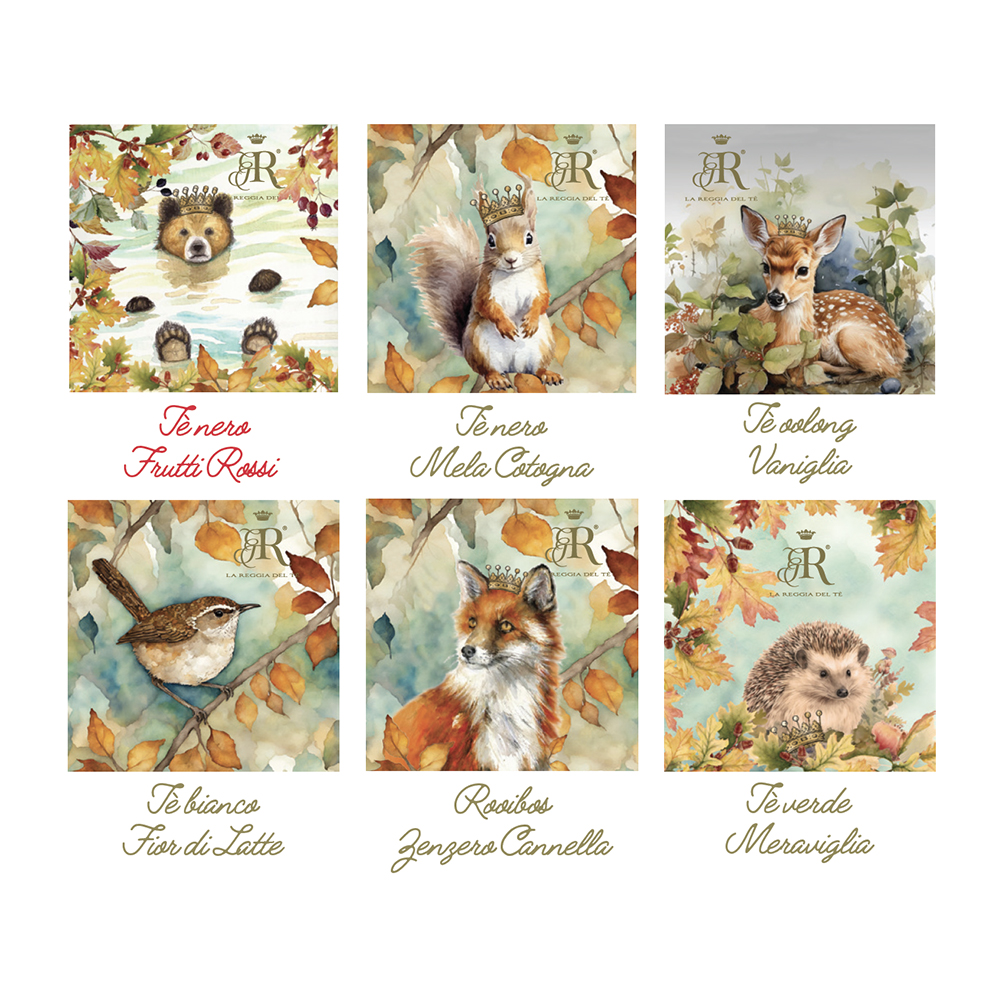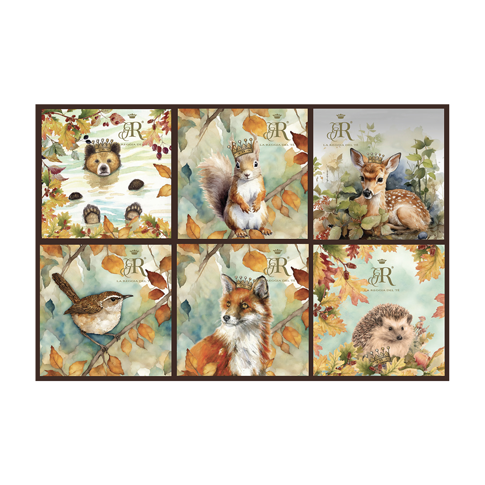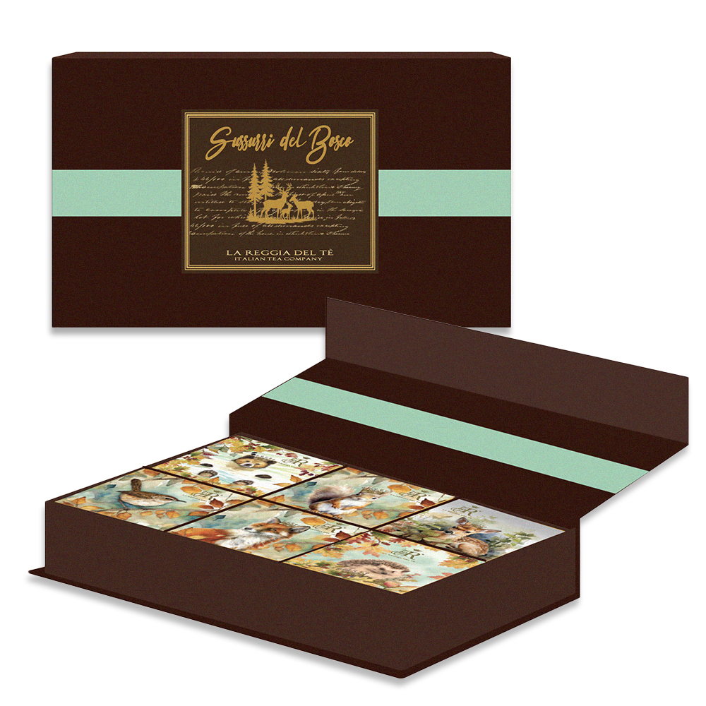 Realizzato in cartoncino rigido con chiusura magnetica e decorato con le delicate illustrazioni degli animali del bosco, custodisce 18 bustine in filtro selezionate da La Reggia del Tè.