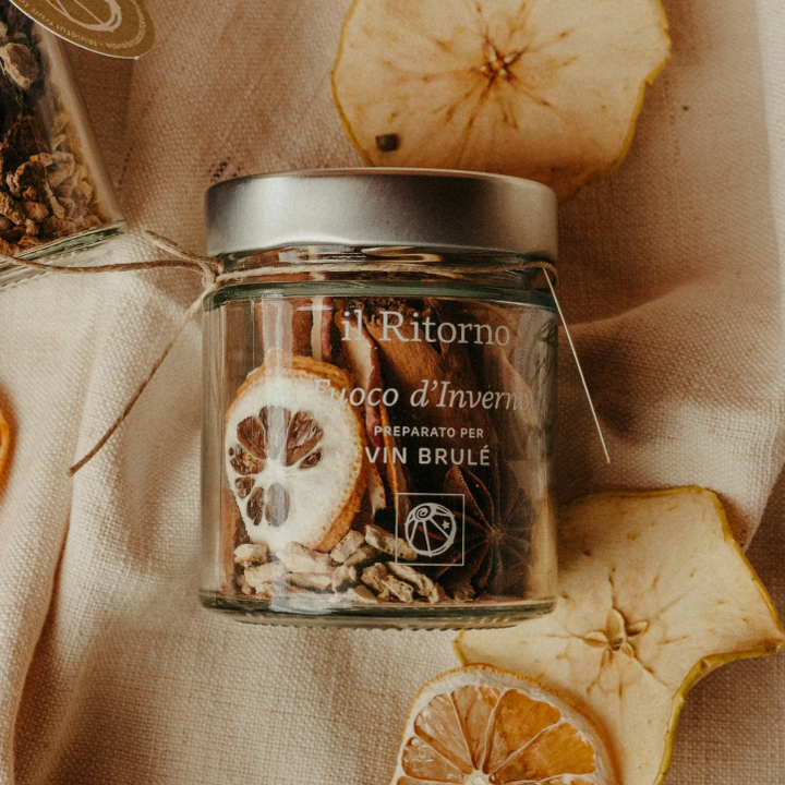 Un mix di cannella, arancia, mela essiccata, anice stellato, chiodi di garofano pronta per essere utilizzata. Pochi semplici passaggi per avere un Vin Brulé pronto in poco tempo.