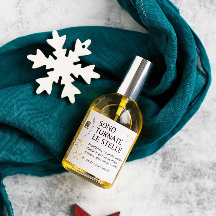 Profumo naturale realizzato con veri oli essenziali. Arancio, Cannella, Mandarino, Cedro Atlantico, Chiodi di Garofano, Litsea, Zenzero e Palo Santo.
